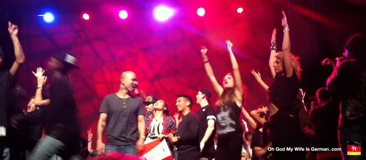 The show began with a scruffy-looking guy with dreadlocks as the MC. He rattled off some German and then introduced the judges. There were 3 of them, and they came from American and Canada. The judges performed solo routines, and then each team — no larger than 20 people — performed their routines in turn. The Wife and I wanted a team called ‘TOCSICK‘ to win. TOCSICK came from the Netherlands, and they were all girls. They wore white t-shirts, black pants and black lipstick. To be perfectly honest with you, they scared us a little. But they were awesome. Their routine seemed to be a mix of Hip-Hop and African dance, and I say that with absolutely no idea what I am talking about. They won 3rd place, but everyone in that auditorium knew they deserved 1st. The crowd went nuts for them and the other dancers got on the ground and bowed down to them. Literally. See if you can spot them in the video below.