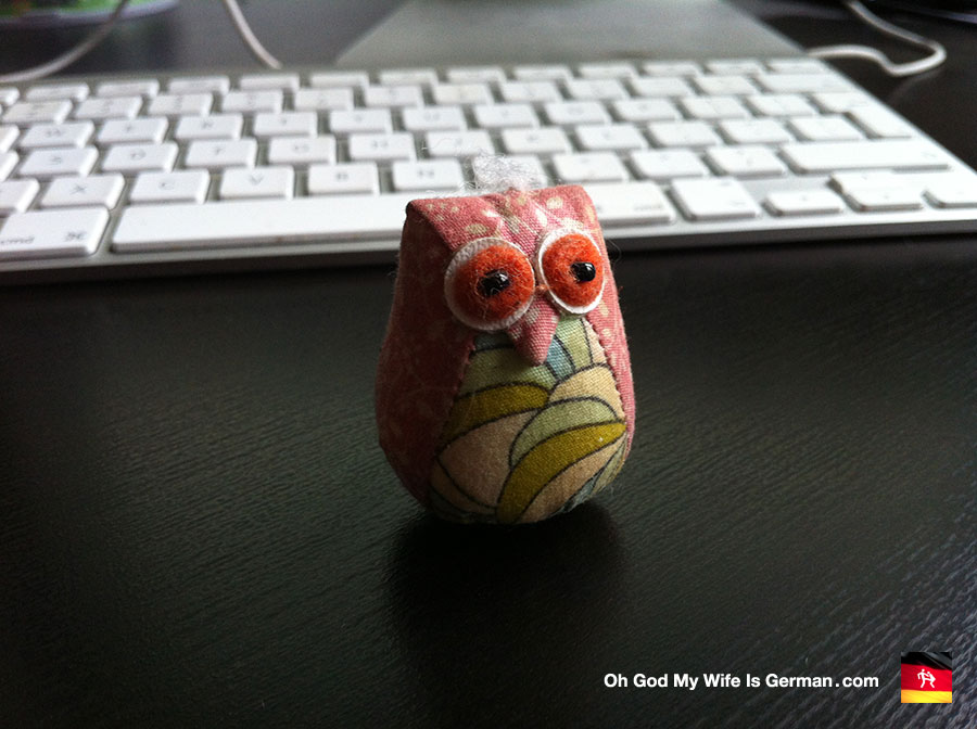 This hideous little thing is the stuffed owl from my wife’s keychain. She named it Mechtild — a girl’s name, apparently. Mechtild is broken, of course, so for the past year she’s been sitting on my wife’s desk being useless. If you pinch her between your fingers, you can hear the beans inside crunch together. It’s creepy. I hate her.