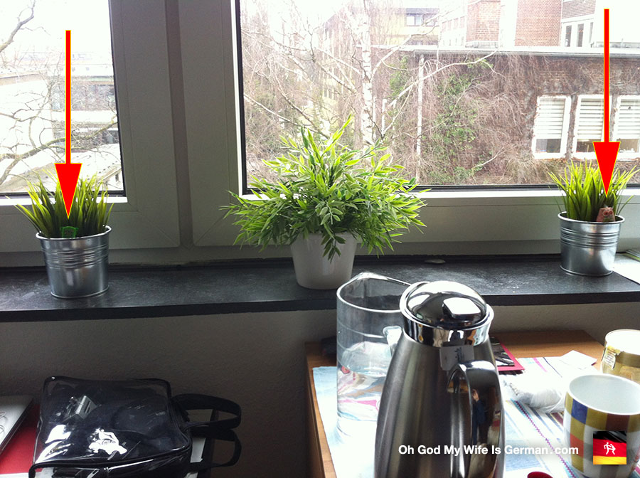 This is my Kinder Surprise toy peeking out of a plastic plant. All day long, he’s just looking at me. Watching. Judging. It’s cute I guess, but not my idea. My German wife was cleaning our office the other day, you see, and rather than let my little toy continue to gather dust beside my computer, the way I like it, she consolidated items and invited a whole new member into our family: