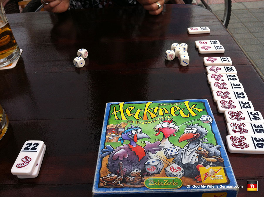 This is my wife and I playing Heckmeck. We love this game; it’s quick, easy and requires no skill at all. A functional understanding of probability will only hamper your success. No, what you need to win is a real “fuck it” sort of attitude.