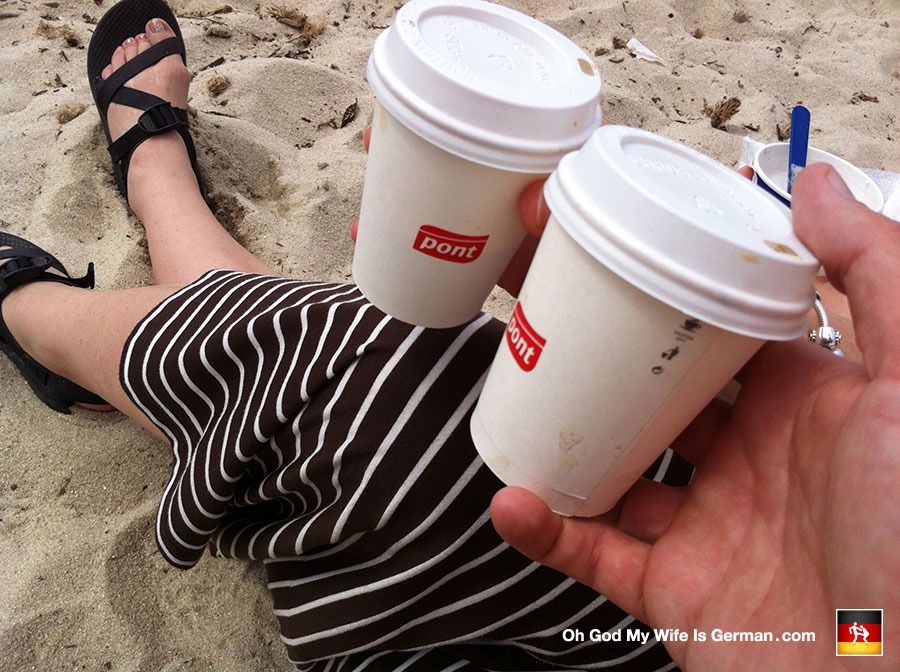 We ordered these coffees so we could drink them on the beach. They were the smallest coffees ever, but it’s funny if you imagine they’re normal sized coffees and my wife’s hand is just enormous.