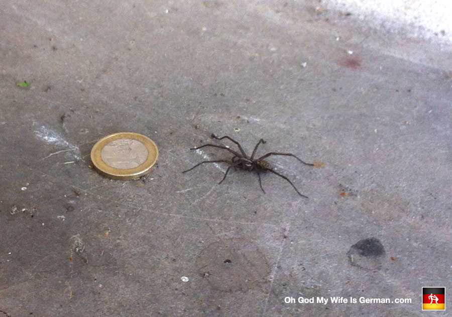 I’m joking right now, but at that moment, I was pissed off. I walked my bike back to the garage, opened the door and practically tossed it inside. Determined to clear the street of every last acorn, I reached for one of the brooms leaning against the wall and saw something move from the corner of my eye. Oh yes, it was the largest spider in Germany.