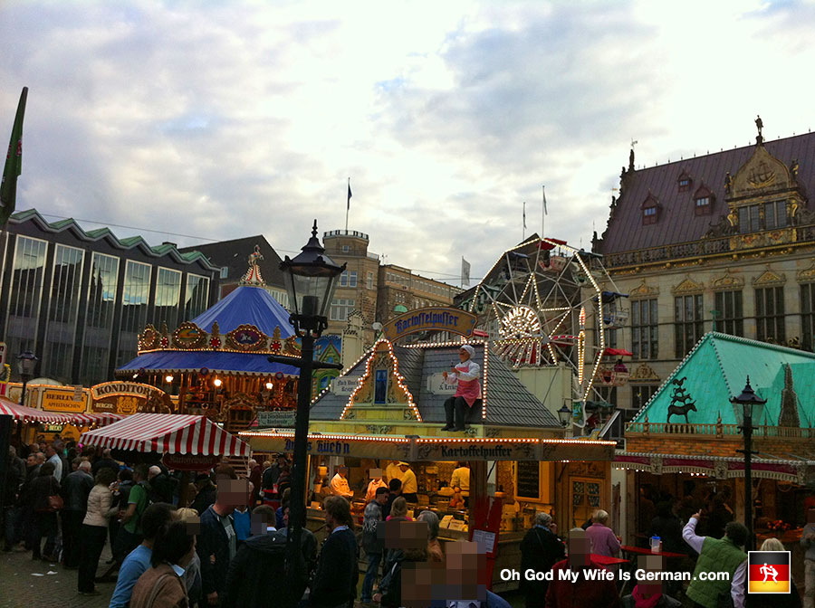 We just happened to show up on the last day of the Bremen Freimarkt. Odd mix of medieval buildings and fatty foods.