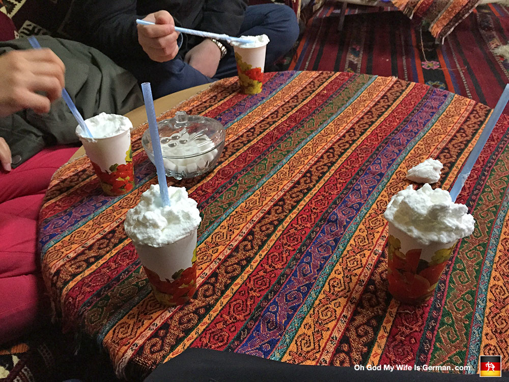This is ayran, a cold yogurt beverage mixed with salt. You might hate it at first, but everyone learns to love it eventually. (Like beer, only not as awesome.)