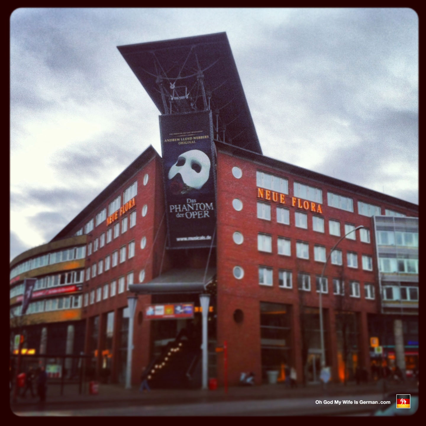 So anyway, knowing her misanthropic husband needs to get out of the house from time to time, my wife ordered tickets to see the Phantom of the Opera at the Stage Theater Neue Flora in Hamburg — 2 hours north of our home in Hannover, Germany. A week later, the tickets arrived in our mailbox and my wife held them proudly aloft, announcing the fact that we would be spending the following weekend watching Andrew Lloyd Webber’s theatrical spectacular in a strange and unfamiliar city: