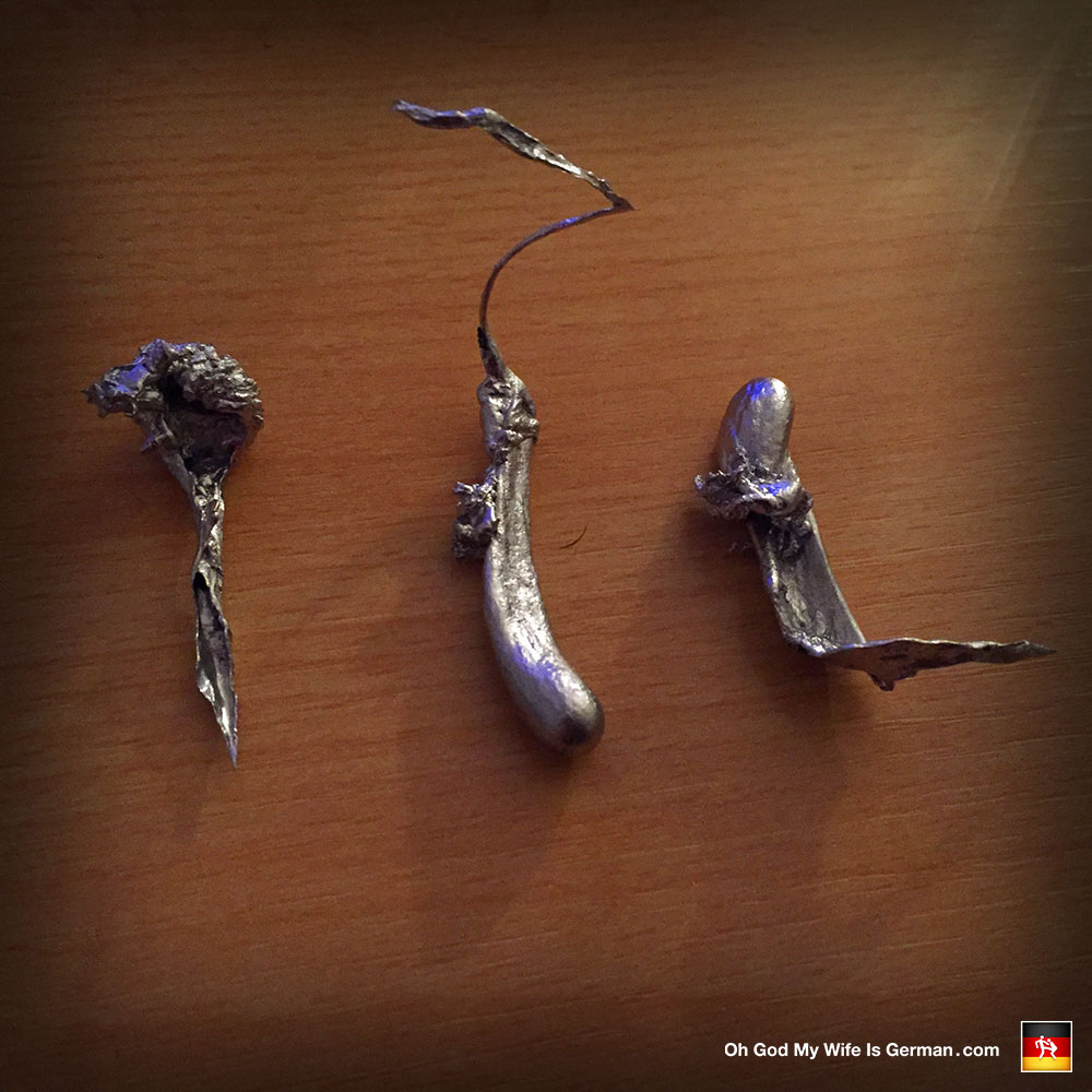 The German word “Bleigießen” refers to a New Year’s tradition in which small pieces of lead are melted over a candle and poured into cold water. The resulting hardened shapes are then interpreted into fortunes for the new year.