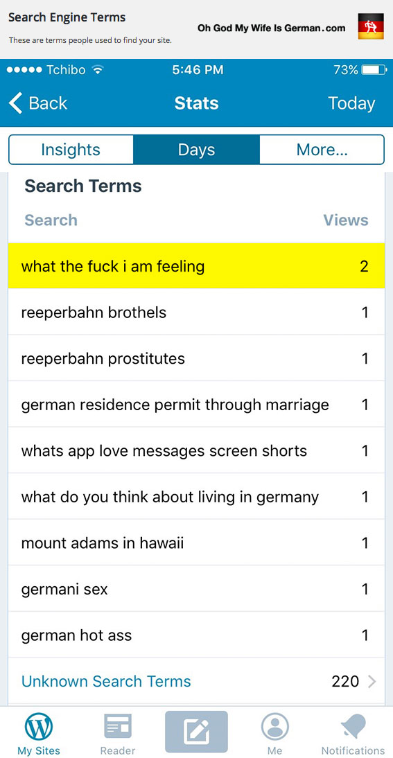 Man, you got some very interesting search hits! I have often wondered about mine, but mine are nothing compared to yours. Unfortunately, while your hit counter gets incremented, the quality of the reader is probably not very useful.